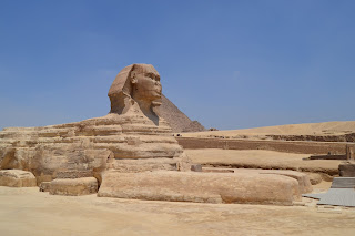 A Esfinge, solitária, debaixo de um calor tórrido, guarda as pirâmides ao longe.